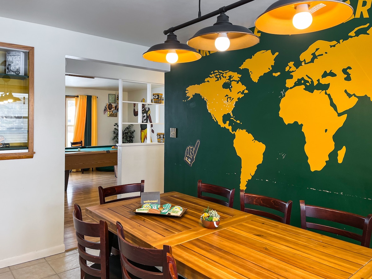 ゲストが作った素晴らしいビデオツアーをチェックしてください。YouTubeで「NFLドラフトウィーク:究極のグリーンベイ・パッカーズAirbnbの中!」と検索してください:) 10人で快適にお休みいただけます。本物の記念品があちこちにあります。ランボー・フィールドから4ブロックで、ドリンクを片手に大きな試合まで歩いて行くのは簡単で、駐車場の手間もかかりません!ああ、そして、あなたの毛皮の友達はいつでも歓迎です。 右上隅の♡をクリックして、後で見つけたり、他の人と共有したりできるようにしましょう!