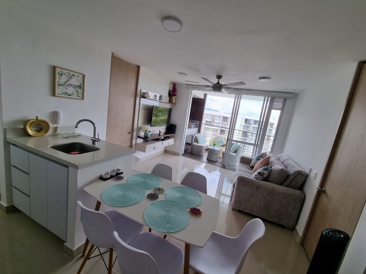 Apartamento de 89 mts, consta de 3 habitaciones con aire acondicionado, cocina dotada, comedor, balcón con BBQ, wifi, televisión, escritorio para trabajar, zona de ropas y un parqueadero privado. El condominio cuenta con cuatro piscinas, una semi olímpica, dos para niños, y una familiar, jacuzzi, sauna, áreas deportivas con canchas múltiples, cancha de futbol 5, canchas de tenis, zona de juegos con billar y ping pong, parque de niños, capilla y parqueadero de visitantes. Se cobra manilla.