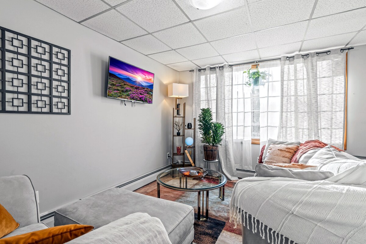新しく改装された、郊外の地区の中心部に位置するマルチユニットの家。 この1階のユニットは、専用玄関のある2ベッドルーム/1バスルームのアパートです。 出張、休暇、長期滞在に必要なものがすべて揃っています。このユニットには、フルキッチン、引き出し式ソファ付きのリビングルームがあります。 キッチンには、フルサイズのステンレス製家電、食器、調理器具、小型キッチン家電が備わっています。高速Wi-Fi、キーレスエントリー/セルフチェックイン、各部屋にスマートテレビ、ユニット内に洗濯機と乾燥機があります。