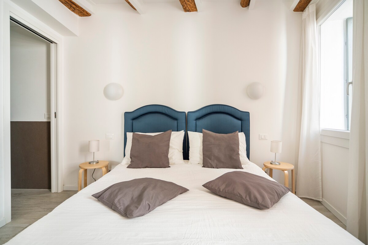 ヴェネツィアの中心部にある専用玄関付きのエレガントなアパート。カップル、家族連れ、または本格的に街を体験したい旅行者に最適です。 中心部でありながら静かなエリアにあり、どの場所からでも簡単にアクセスでき、サンマルコ広場とリアルト橋から徒歩わずか数分です。 リビングエリアからはコルテ・ブレッサーナが見渡せ、プライベートで本格的な雰囲気を味わえます。北欧スタイルのインテリアは、モダンな快適さと機能性を兼ね備えています。