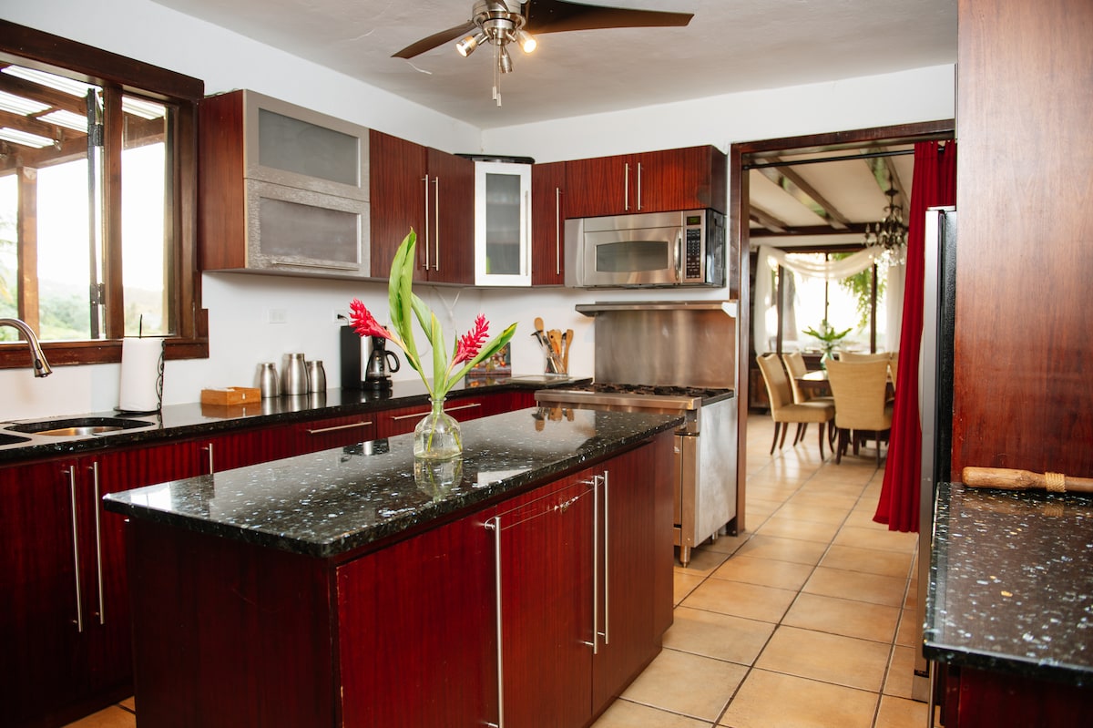 セイバのビーチフロントの町の緑豊かな丘の上にあるこの2ベッドルームの家は、豪華で静かな楽園で、海、熱帯雨林、山、近隣の島々の壮大なパノラマビューを楽しめます。 宿泊施設に近づくと、鮮やかな花々が咲いている曲がりくねった私道が入り口に続き、魅惑的な隠れ家の雰囲気を演出します。 サン・ホセ国際空港から車でわずか1時間、エル・ユンケ国立熱帯雨林から車で30分です。