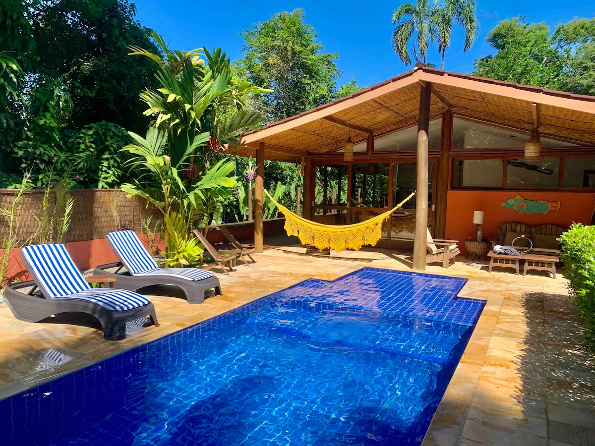 Casa arejada, quintal arborizado em meio a Mata Atlântica. Construção avarandada com vista para as montanhas e natureza. Um belo e amplo jardim com cerca. Ideal para receber seu pet que poderá brincar em segurança para que você não se preocupe em deixa-lo solto, perfeito para ficar sossegado.@Uma_Casinha fica situada aprox. 17 min do centro de Paraty e 2Km da via de acesso às famosas praias e cachoeiras de Trindade. Mercado e farmácia próximos. Delivery chega a porta. Há transporte público