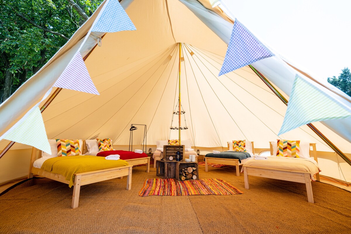 スーパーキングベッドと豪華な寝具を備えたベルテントは、素晴らしい田舎の真ん中にあります。地元にはたくさんのアクティビティ、見どころ、イベントがあります。テントから直接歩いて行けます。徒歩3分の場所に、自家製の食べ物と地元のエールを提供する地元のパブがあります。 IHコンロ、冷蔵庫/冷凍庫、バーベキュー、電子レンジ、ケトル、トースターをご用意しています。 必要に応じて、子供用の自動膨張マットレスを2台用意できます。 テントは専用のプライベートエリアにあり、専用にご利用いただけます。