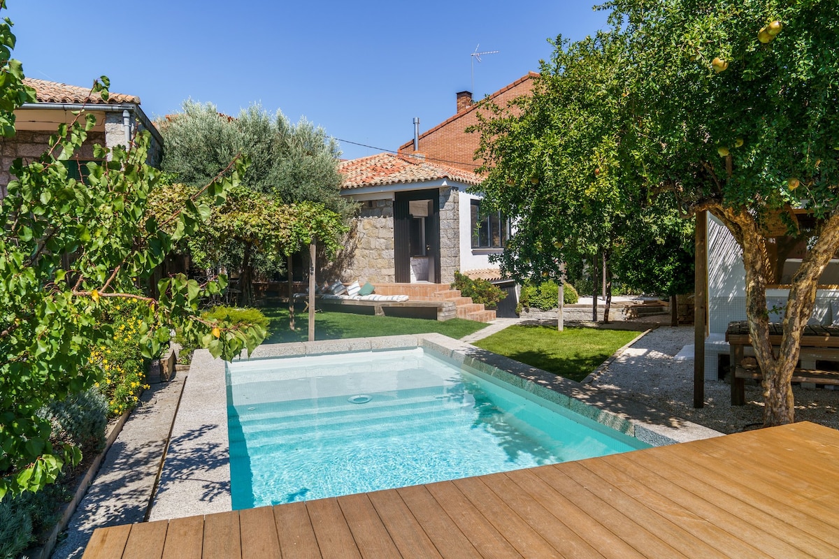 緑に囲まれた美しい石造りの家で、マドリードの山々をお楽しみください。果樹や花の美しい庭園の景色を眺めながら毎朝目を覚まし、山を眺めながら広いテラスで朝食をとることができます。 螺旋階段や石のアーチなどのディテールが、私たちの家を特別でユニークな場所にしています。 この時期のプールはとても爽やかで、夜間照明があるので星空の下で泳ぐことができます。