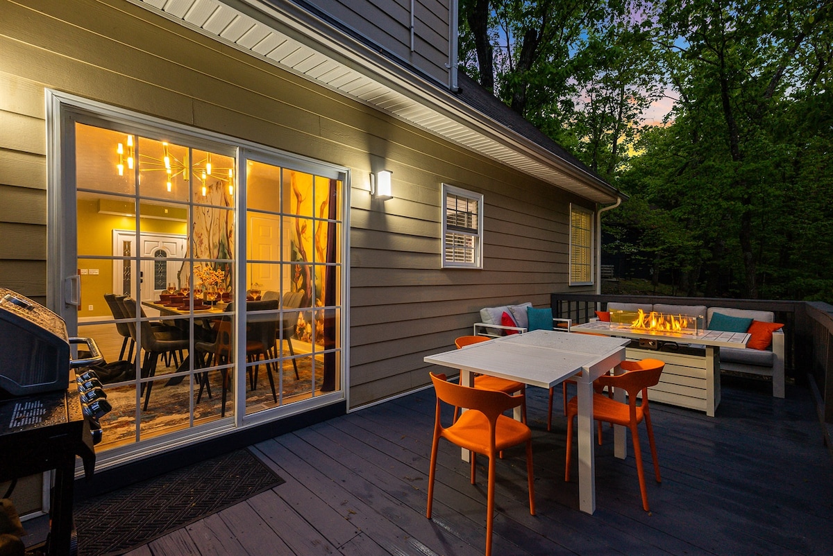 山の緑に囲まれたデッキでコーヒーをお楽しみください。夕方は、ディナーをグリルしたり、ホットタブでリラックスしたりしながら、ファイヤーピットをお楽しみください。室内にはガス暖炉とスマートテレビがあり、ゲームルームで遊ぶこともできます! トイレトレーニングを受けた犬のためのフェンス付きの庭のある新しくモデル化された家です。ペット料金がかかります!マサヌッテンリゾートゲート内にあり、スキー、そり滑り、アドベンチャーパーク、ゴーカート、ゴルフ、乗馬、屋内ウォーターパーク、山腹のレストランなどが楽しめます!無料プールもあります!