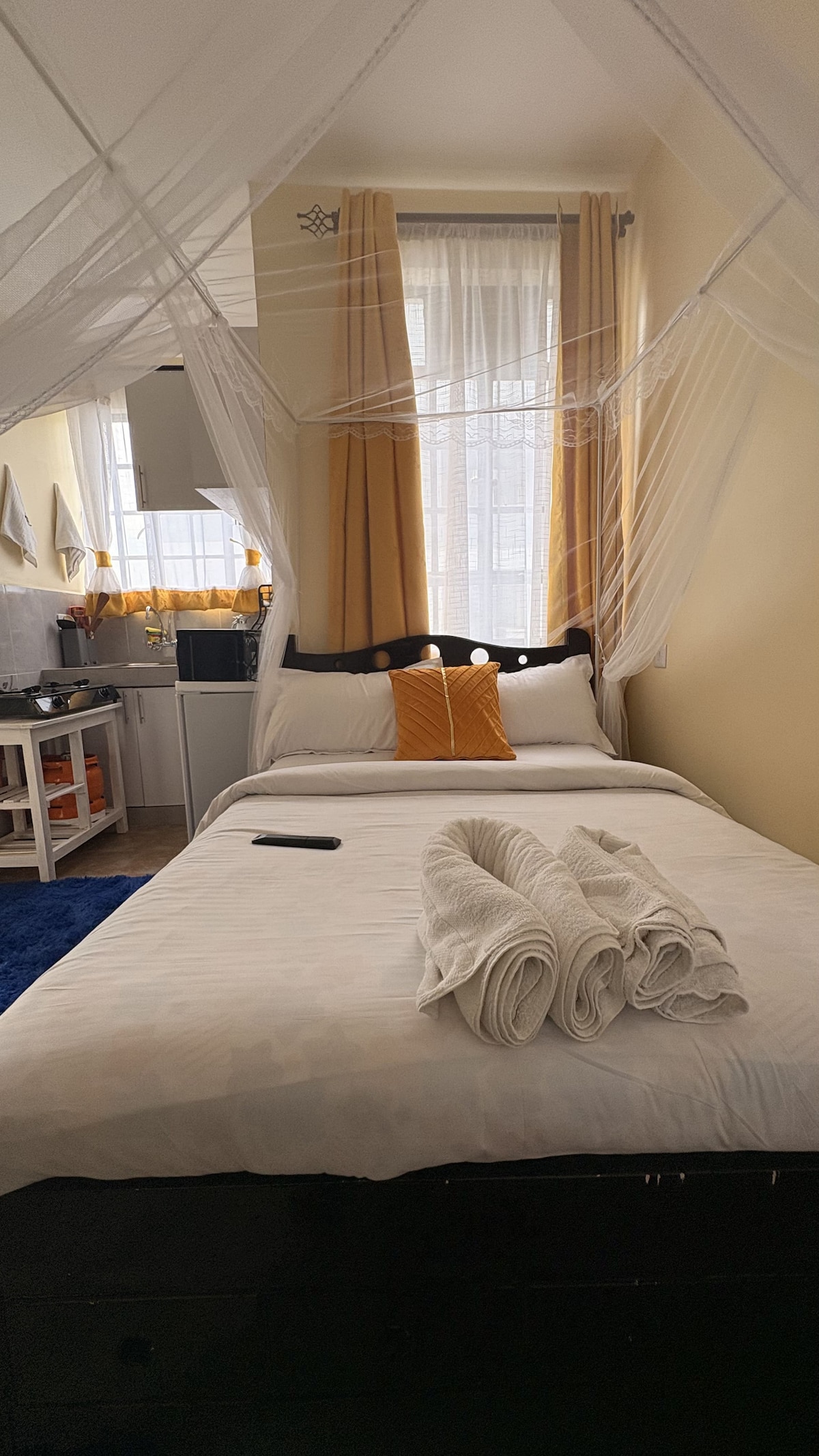 Forget your worries in this spacious and serene space. This own compound studio apartment is located in the heart of Kisii town . Super cozy with a touch of rustic modern themed designs . We also have a workstation for our corporate clients .