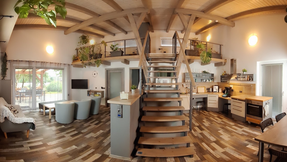 アパート全体を独り占めできます。ベッドルームにベッド2台、高品質のマットレスを備えたソファベッド2台。広いテラスをご利用いただけます。私たちの家族は1階に住んでおり、屋根裏にはアパートに隣接する別のアパートがあります。ゲストは、池の景色、近くの森での散歩やサイクリング、周辺の文化的名所を訪れる機会を楽しんでいます。家はインドリフフフラデツ近くの村にあります。通過中でも、数日間滞在する場合でも、ゆっくりとおくつろぎいただけます。