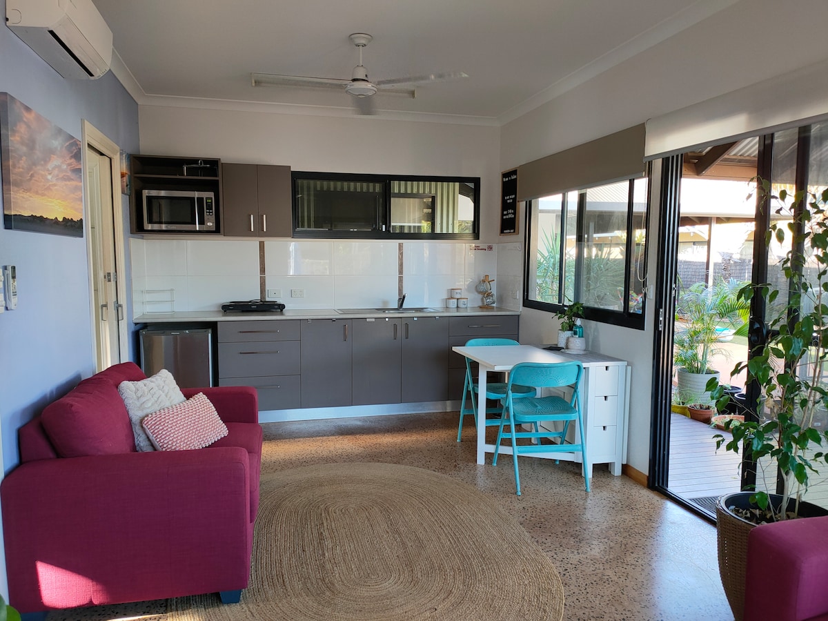 Kitchen, WIFI, laundry & pool! 5 min drive to Coles/shops, 9min to Cable Beach. 600m to Town Beach: cafe, markets, museum, playground, waterpark & ocean. Bus stop on our street + convenience store a walk away. The Retreat is a seperate building behind our home (semi private entry). Queen bed & double sofa bed (cot/high chair on request). Shared: pool, outdoor shower & laundry. 2 dogs, chickens & toddler on the property. Children most welcome! Old Broome is the original settlement area.
