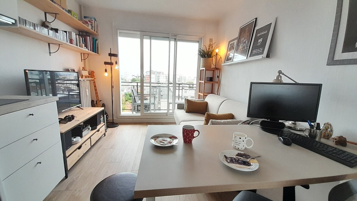 ロマンヴィルの芸術地区の中心部に位置するこの静かでエレガントな宿泊施設でリラックスしてください。 地下鉄のRaymond Queneau駅まで徒歩8分、パリ中心部まで35分です。すべての商店やウルク運河に近く、散歩や快適な景色を楽しむことができます。 最近建てられた住宅の最上階にあるこの25平方メートルのココンは、カラフルな装飾と街のパノラマビューを楽しめる素晴らしいテラスで魅了します。