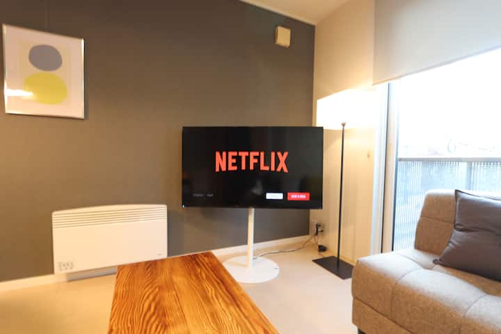 5名様が不自由なく滞在できるよう、ダイニング、ソファも配置。テレビは移動可能なスタンドタイプで、ダイニングでも視聴しやすいようにしました。