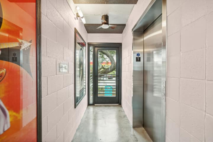 この部屋は2階にあり、商業施設街の活気の中にあるため、騒音が聞こえますのでご注意ください。建物の横には荷卸し用の駐車場があります。専用駐車場は、荷卸しゾーンの1つ裏の通りにあり、建物まで徒歩2 ~ 3分です。