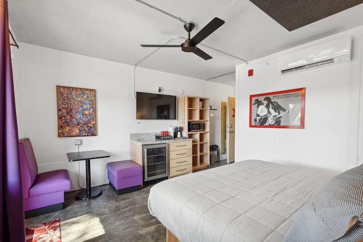 スタジオルームには、リビングエリアとキングサイズベッドが同じ部屋にあります。フルバスルームがあります。このワンルームは2階にあります。
