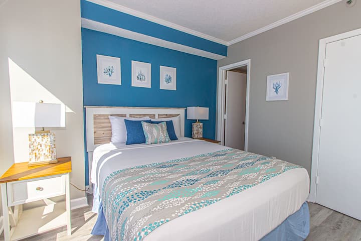 ゲスト用の寝室は、コンドミニアムに入ると右側の最初の寝室です。 この寝室にはフルベッド2台、収納用のドレッサー、スマートテレビ付きのエンターテイメントスタンド、2つのベッドの間に小さなナイトスタンドが備わっています。 マットレス、ボックススプリング、ヘッドボード、インテリア、窓トリートメントの両方が新品です。 この部屋では、海の大通りを見下ろす専用バルコニーもあり、夕日を眺めることができます。