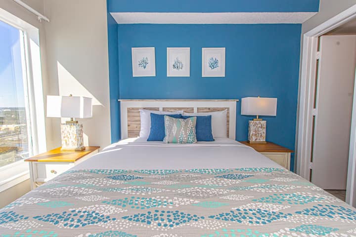 マスターベッドルームは右側の2つ目のベッドルームで、クイーンベッド、収納用クローゼット、オーシャンビューバルコニーへのアクセス、専用バスルームが備わっています。 窓トリートメントは、ユニット全体のインテリアと塗装に合わせて新品です! マスターベッドルームには、新しいフレーム、ボックススプリング、マットレス、ヘッドボード、ナイトスタンド、インテリアがあります。 マスターベッドルームからの眺めは他に類を見ず、建物の南側にある美しい夕日にゲストは驚くでしょう。