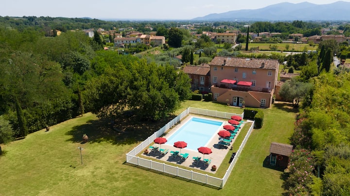 Villa al Falchettoは、ルッカに近い丘の上にあり、周辺の田園地帯の素晴らしい景色を誇っています。この家は10,000平方メートルの広い庭園に囲まれており、手入れが行き届いており、コットの花瓶、花、茂み、木々で飾られており、生け垣と金属製のフェンスで完全に囲まれています。離れ(コテージ)の近くには、小さな屋根付きのベランダがあり、家具が備わっています。ヴィラの1階には大きなパノラマテラスもあり、屋外でのディナーに最適で、家のゲスト全員に十分な広さです。また、3つのポータブルバーベキューと石造りのバーベキューもあります。また、塩水のプールがある広いオープンエリアもあります。プールは6メートル×12メートル、深さ1.2~1.4メートルで、完全に囲まれ、サンベッド15台、屋外ソーラーシャワー、日陰には大きなオークの木があります。敷地内、オリーブの木々の間、近くの小川での散歩も可能です。屋外エリア全体が手入れされています。監視カメラ付きの自動ゲートが物件につながっており、ゲストは荷物を降ろすために短時間駐車することができます。一方、専用(警備されていない)駐車場は物件の外、入り口の隣にあります。