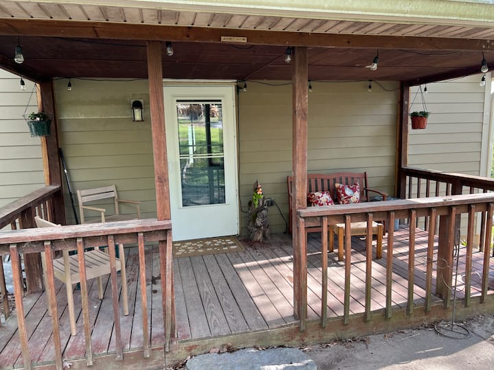 屋根付きの裏ポーチから入室し、ここに座って日陰でおしゃべりできます。野生動物を聞いて/見てください。