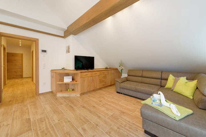 当社の「アパートメントマイホーファー」は、森の端にある静かで日当たりの良い場所に新しく建てられた家の中にあります。これに属する50m²の屋上テラスと20m²のバルコニーで、ゆったりとした時間をお過ごしいただけます。