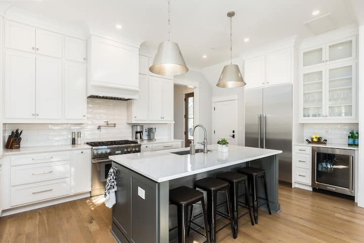 Thermadorのステンレス製家電、ワイン冷蔵庫、カスタムキャビネット、プレミアムカウンタートップを備えたグルメキッチン。