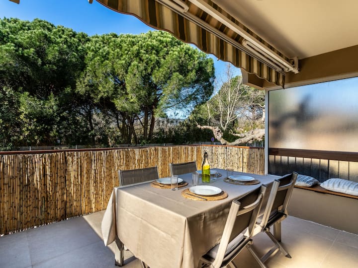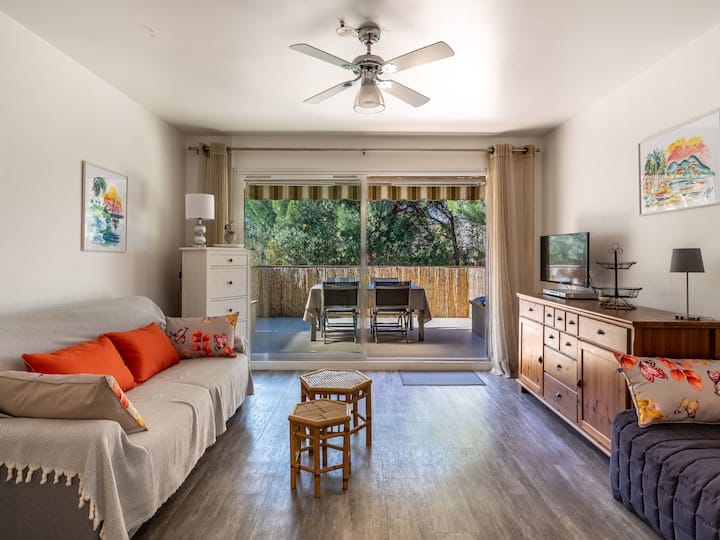 Residence "Parcs du Lavandou". On the outskirts, 700 m from the centre of Lavandou, in a quiet position, 800 m from the sea. For shared use: garden with lawn and plants, public parking on the road. Shop 800 m, supermarket 400 m, restaurant, bakery, café 800 m, bicycle rental 400 m, 15 minute walk to the centre, bus stop "Lavandou Gare routière" 800 m, sandy beach "Lavandou" 800 m. Nearby attractions: Saint Tropez 40 km, Magic World 26 km, Parc Olbius Riquier 21 km, Le Jardin des Méditerranées 15 km. Hiking paths: Sentiers du Littoral. The keys‘ handover takes place by the agency Interhome in Le Lavandou. parking available from 06/05/2021 to 08/28/2021.