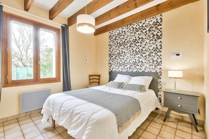 この家には、4つの寝室があり、最大8人まで収容できます。最初の2つは1階にあり、それぞれダブルベッドを備え、カップルに最適です。他の2つの寝室は2階にあり、1つは子供に最適なシングルベッド3台、もう1つはダブルベッドとシングルベッド1台があります。どちらも屋根裏部屋スタイルで、天井梁が見える快適な雰囲気で、夜はよく眠れます。