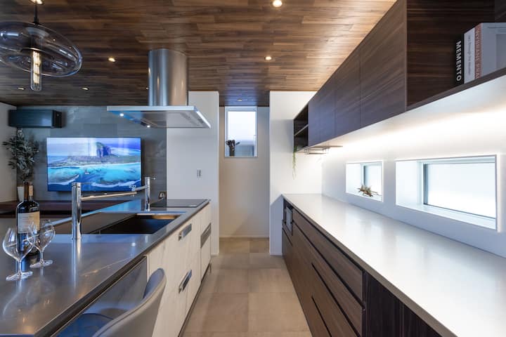 階段を上って2階へ上がれば、カウンターキッチン、スマートTVや革張りのソファがセンス良く配置されたリビングダイニングがお出迎え致します。
