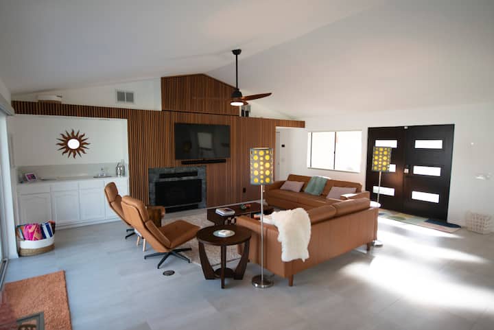 この真新しく広々としたインテリアのモダンなミッドセンチュリーの静かな空間で、一日の遊びの疲れを癒しましょう。 この2ベッド、2バスルームの家には、隠しベッドと大きなインフレータブルベッド2台も備えられています。