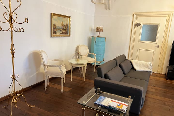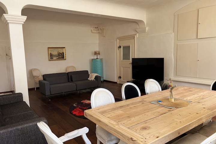 このアパートのすべてが歴史的で、床から16世紀の階段まであります。 非常に大きな二重窓が、明るい雰囲気と共に、隣接する教会からの遮音と多くの光を提供します。 キッチンからは、歴史的な塔の内部階段を通って、1階のバスルーム、リビングルーム、ベッドルームにアクセスできます。 これらの部屋は、階段を通る2つ目の非常にスムーズな階段でもアクセスできます。 アパートの前にある席があるプライベートガーデンもご利用いただけます。 2階のバルコニーは 他のゲストと共有です。