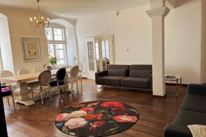 このアパートの塔には、設備の整ったモダンなキッチンがあります。 寝室の隣には、ウォークインクローゼットがあります。 大きな修道院のテーブルには多くのゲストが座ることができるので、家族や友人との集まりにはこのスイートが最適です。 より多くのスペースが必要なゲストのために、小さなホールを予約することができます。 45名様までのイベントについては、事前にホストにお問い合わせください。