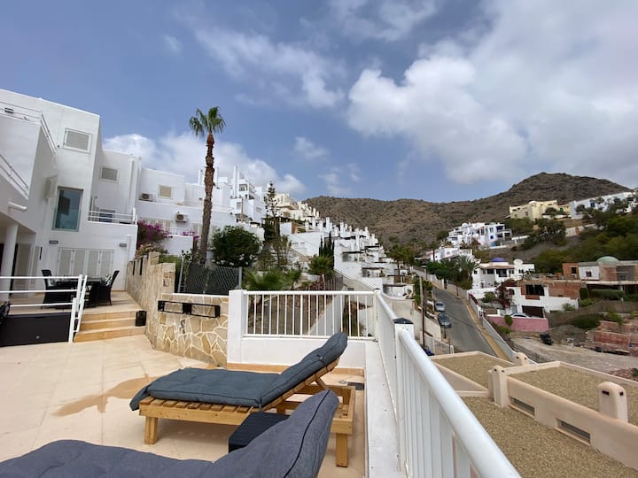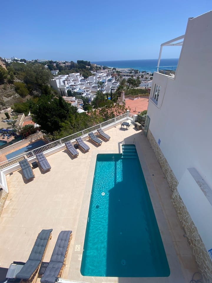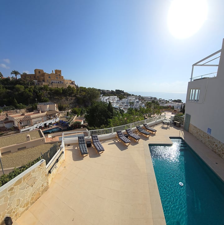 素晴らしい眺めを楽しめる屋上テラス。素晴らしいプールエリア、8m x 4mのプールと快適なサンラウンジャー。