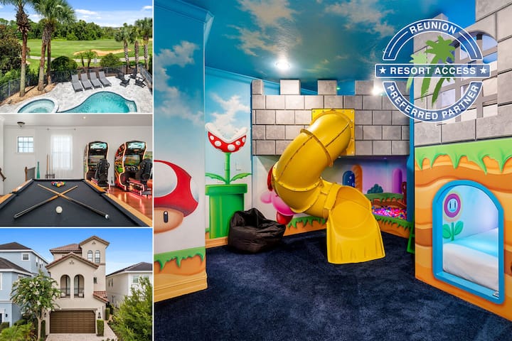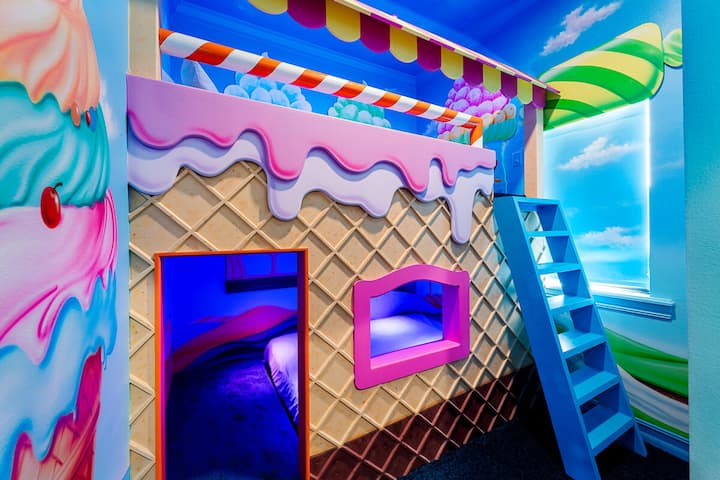 3階の子供用ダブルベッドルームは、楽しい隠れ家です。ゲームをテーマにしたセクションには、スライド付きのクイーン・ベッド2台があり、最大4名様まで収容できます。キャンディーをテーマにしたエリアには、クイーン・オーバー・クイーンの二段ベッドがあり、滞在にちょっとした気まぐれをプラスしています。
