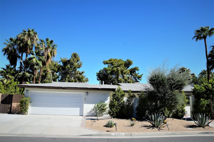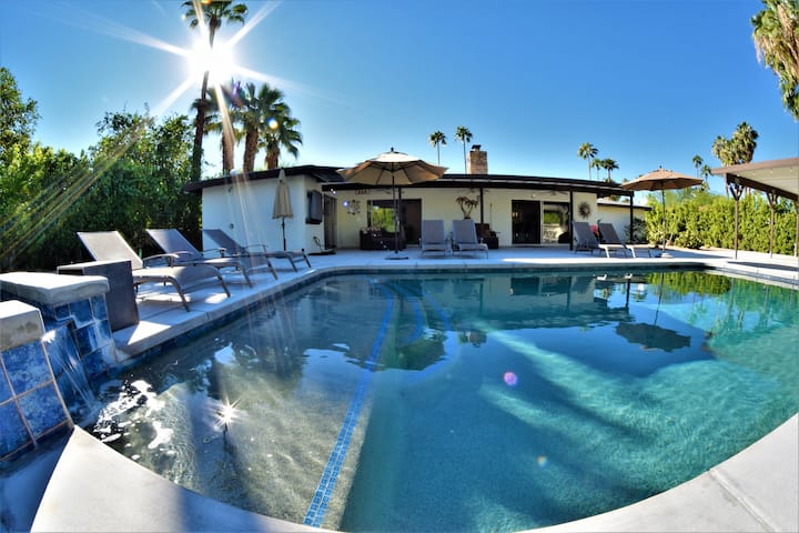 サウスパームスプリングスのターキッツゴルフコースにある美しいミッドセンチュリーの家です。 家は静かで広々としており、ゴルフ場、山、夜の夕日の眺めが素晴らしいです。 プールサイドでリラックスしたり、ファイヤーピットのそばに座ったり、ゴルフを楽しんだりできます。