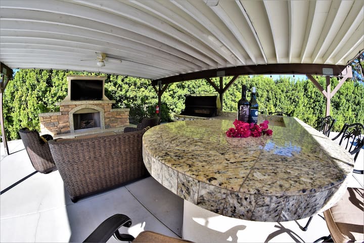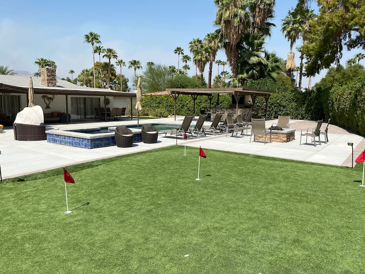 サウスパームスプリングスに位置し、広大な13,000平方フィート以上の敷地に建てられた美しいゲットアウェイホームです。この完全に改装されたハイテクホームは豪華で、設備が整っており、南カリフォルニアのライフスタイルの雰囲気と洗練さ、または新しく改装された磨かれたコンクリートの床を備えたパームスプリングスの中世の美しさを捉えています。この家はゴルフ場にあり、プライバシーが確保されており、美しい山の景色と砂漠の景観が広がっています。サウスパームスプリングスに位置するこのモダンな3ベッドルーム、3バスルーム、1702平方フィートのシングルレベルハウスは、静かなリトリートで、ご滞在中に家で休息/リラックスするというアイデアで、休息、リラクゼーション、またはグループリトリートに理想的です。家の中は広々としたオープンフロアで、誰でもゆったり座れます。外に出て、プールサイドの多数の長椅子や、2つのラナイの下にある深い座席のコレクションでリラックスしたり、付属のスパでリラックスしながら、静かな敷地内や夜の夕日を眺めることができます。 裏庭には、新しく建設された屋外エンターテイメントエリアがあり、大きなラナイの下に大きな美しい岩の暖炉、夜には素晴らしい夕日が沈むゴルフ場の近くにある焚き火台、40インチのプロフェッショナルなライオンBBQを備えたカスタムの屋外キッチン、マウント冷蔵庫とシンクの下に、カウンターの周りに座ってテレビを見たり、夕日や敷地内を眺めたりできる多数のカウンターハイチェアがあります。 さらに、屋外キッチンには、ラナイの下にある暖炉の上に吊るされた58インチの薄型テレビと、マスターベッドルームのスライドドアの近くにあるパティオカバーの下にある別の40インチの薄型テレビがあり、屋外でお気に入りのスポーツチームを楽しんだり、テレビを見たりすることができます。 屋外テレビはどちらもスマートテレビなので、多くの視聴オプションから選択できます。 バーベキューとシンクを備えたメインパティオカバーには、涼しい季節に備えた屋外ヒーターも備わっており、暖炉の暖かさとともに、夜遅くまで外で時間を楽しむことができます。 さらに、新しい7ホールのパッティンググリーンとボッチェボールコートは、パッティングを練習したり、友達や家族とボッチェボールゲームを楽しんだりできるので、家を楽しむもう一つの理由になるでしょう。