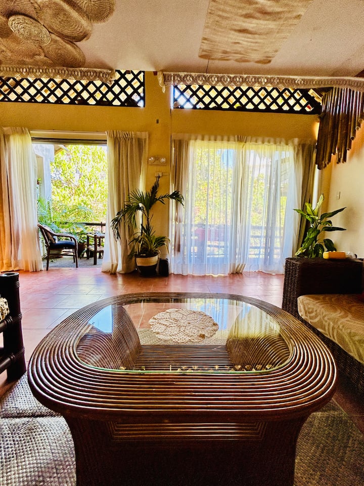 L字型のソファがある居心地の良いリビングエリアに入ると、誰かが快適に寝ることができます。 お部屋は、地元の照明を吊り下げて美しくデザインされており、本格的な島の雰囲気を醸し出しています。
