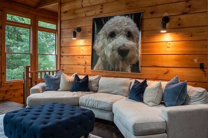 メインフロアのリビングエリアには、ラップアラウンドソファ、特大の椅子2脚、大画面テレビ、コーヒーテーブル、薪ストーブ、外に開く大きなドアがあります。 自然光と座席が豊富です。