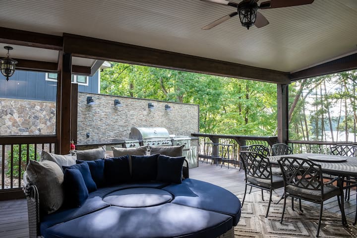 屋外エリアには、別の大きなソファを備えたスクリーン付きポーチ、8つの椅子を備えたダイニングエリア、ガスグリル、ブラックストーン製鉄板グリル、サイドバーナー、冷蔵庫、冷凍庫を備えた屋外キッチンがあります。 バーエリアと別の大きな薄型スクリーンもあり、広大な湖の景色を見渡しながらカクテルやカジュアルな食事を楽しみながら試合を楽しむことができます。
