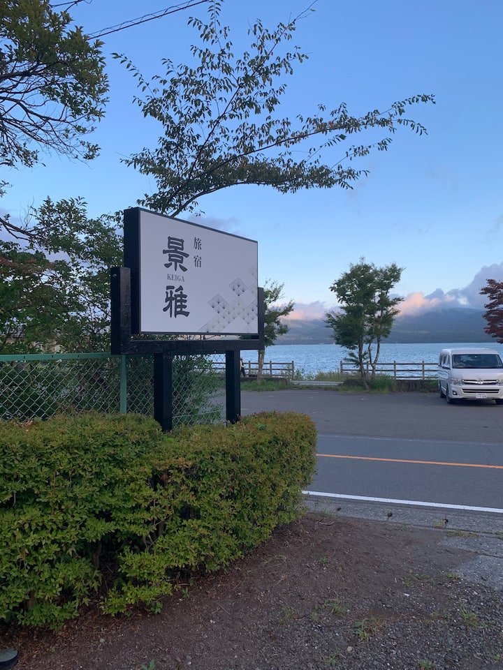 景雅 KE IGA は富士山と山中湖と共にお客様をお迎えします。湖まで徒歩30秒の好立地!