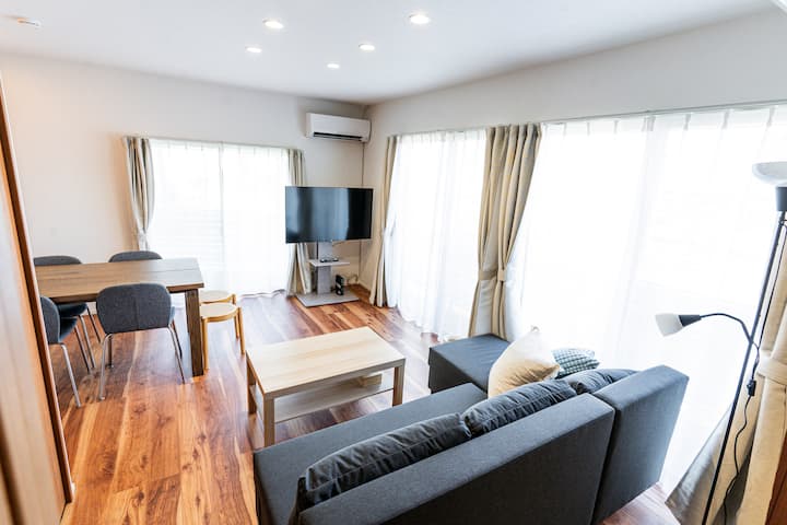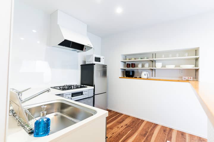 広々としたキッチンと充実した調理器具でお料理を楽しめます。基本的な家電やアメニティも揃っているので長期滞在でも快適にお過ごしいただけます。デスクスペースがあり、リモートワークにも最適です。卓上ミラーもあり、ドレッサーとしてもご利用いただけます。50インチのTVと広々したリビングで8名でもゆったりおくつろぎいただけます。