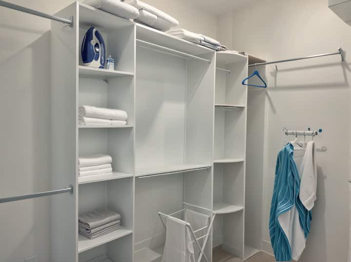 ⦿寝室1 (1階):フルサイズベッド1台と広々としたクローゼットスペースを備えた広々としたスイート—完璧なプライベートリトリート。