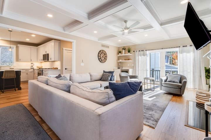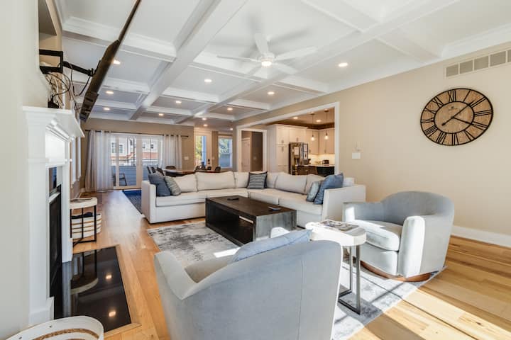 美しい格間天井の明るいリビングルームエリア。大きくて快適なセクションソファとモダンなロッキングチェアを備えたガス暖炉。テレビにはケーブルテレビの全チャンネルとNetflix、Amazon、Huluなどのストリーミングサービスが搭載されています。