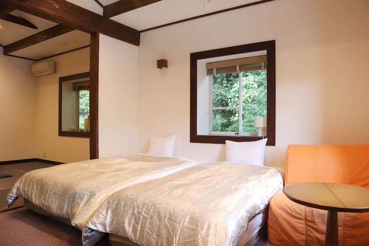 (お布団4組:シングルベッド1台:ダブルベッド1台・テーブル・テレビ ・電気ケトル・ミニ冷蔵庫・空気清浄機・ユニットバス)