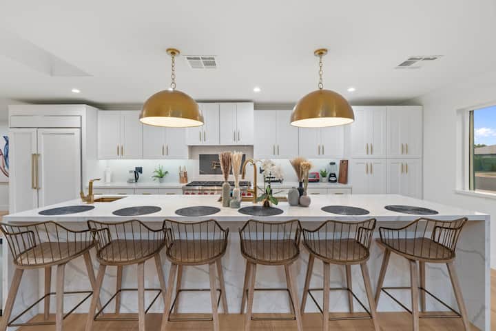• プライマリーベッドルーム1:キングサイズベッド、ダブルシンクの洗面台、ウォークインシャワー、浸ることのできるバスタブ、ウォークインクローゼット、プライベートパティオアクセス、裏庭を見渡せる大きな窓。