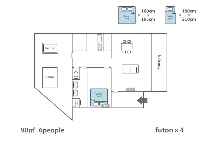 豪華なクイーンサイズベッドと4組の快適な布団を備えた美しい客室で、最大6名まで快適に滞在できます。スタイリッシュなインテリアは、新鮮で清潔感のある雰囲気を醸し出し、休息とリラックスのための静かな隠れ家を提供します。