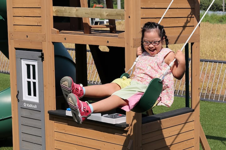 裏庭には大型遊具(滑り台・ブランコ・ボルダリング)や巨大トランポリン、水遊びセットがあり、子どもたちは大喜び!