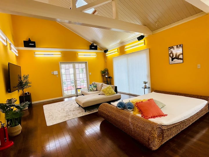 ・天井が高く開放的な空間。明るいイエローの壁がリゾート気分を演出。