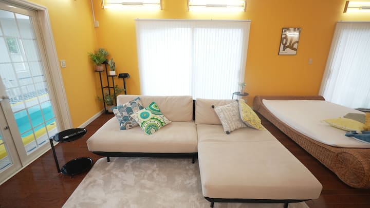 色彩豊かな客室や開放的なリビングで、最大6名まで宿泊可能。