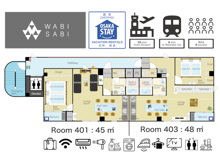 大阪 難波 1LDK 45㎡ WS401 最大6人 好立地 充実設備 清潔空間 カフェバー 国際交流