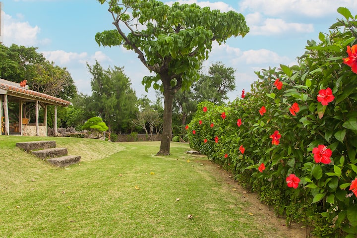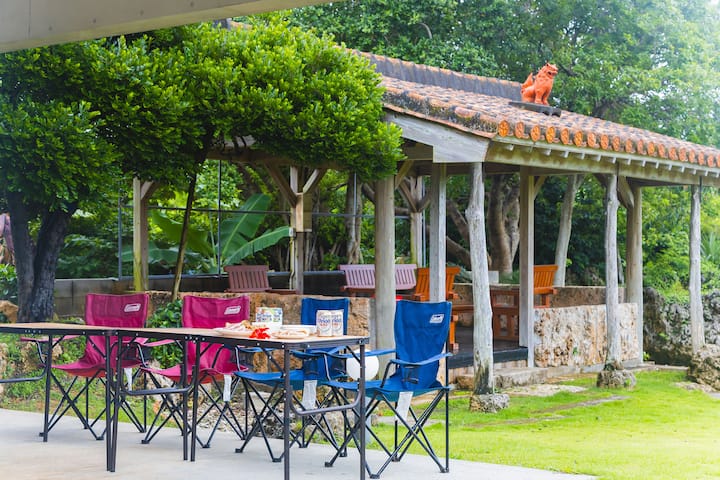 ロングステイで楽しみたい沖縄の島々。当宿は那覇空港から1時間20分のドライブで離島の雰囲気を満喫できます。東屋のある広々とした庭に囲まれた一軒家で、プライベートな空間でお過ごしいただけます。宿の裏はすぐビーチになっており、家族や友人同士でゆっくり海を楽しめます。