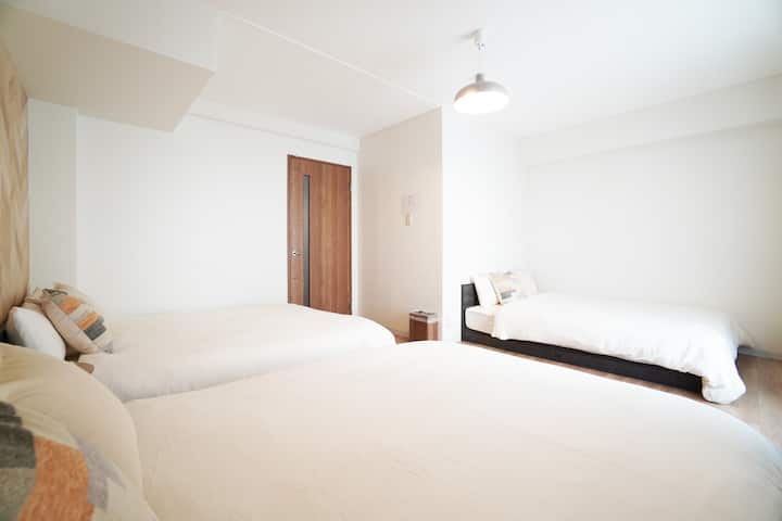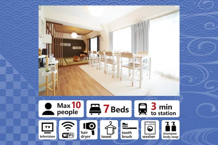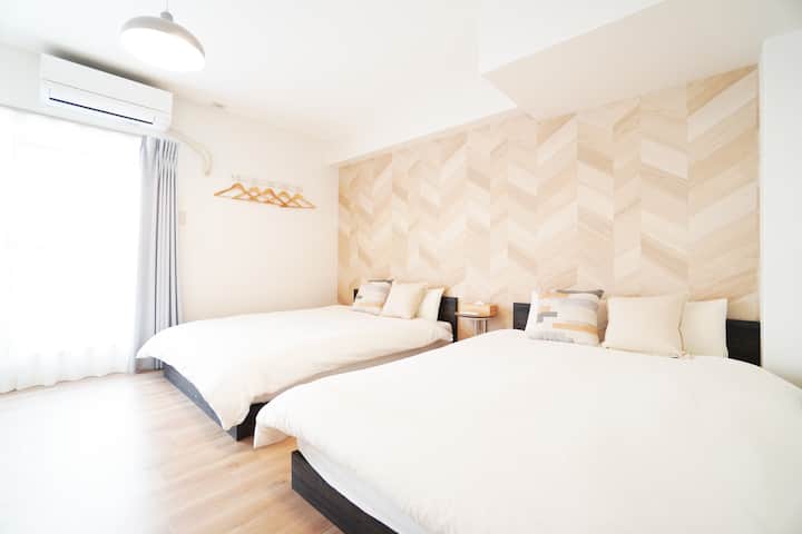 大阪の黒門市場の中心部に位置する完全個室のアパートを提供します。アパートメントには、ダブルベッド3台とシングル布団4枚が備え付けられており、最大10名まで宿泊することができます。タオル、歯ブラシ、シャンプー、ボディーソープなどの基本的なアメニティは、お客様に快適に過ごしていただくためにご用意しています。また、アパート内では無料Wi-Fiをご利用いただけます。また、建物にはエレベーターがあり、アクセスしやすくなっています。