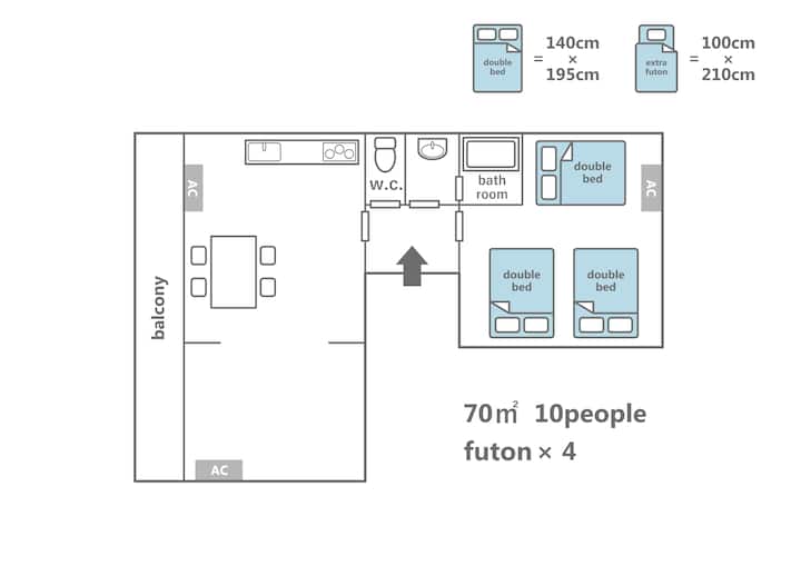 70㎡の禁煙アパートメントには、140cm×195cmのダブルベッド3台と、100cm×210cmのシングル布団4枚をご用意し、合計10名様までご宿泊いただけます。原則として、ダブルベッドを先にセッティングいたしますので、別々にお休みいただく必要がある場合や、寝具にご指定がある場合は、事前にご連絡ください。また、エキストラベッドの追加はできません。