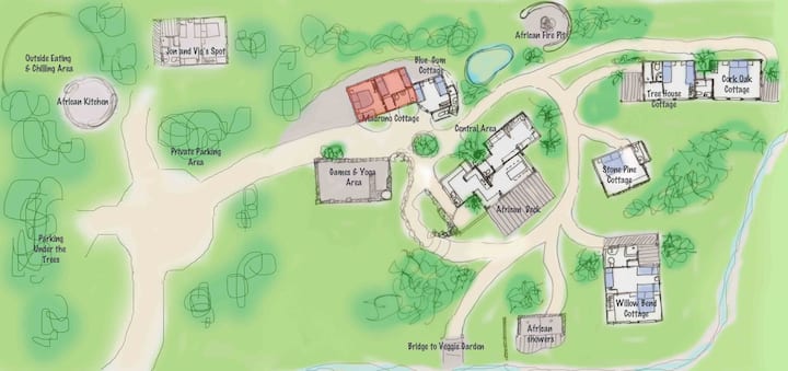 この宿泊施設はユニークな体験です。 コテージと客室はコルクオークの森の中にあり、川、庭園、自然の風景に囲まれています。